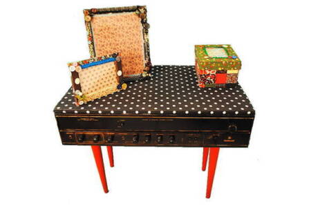 Uma vitrola usada foi o suficiente para a loja Caçambaria, especializada nos conceitos de Economia Criativa, criar uma mesa de centro com pés de palito vermelho.
